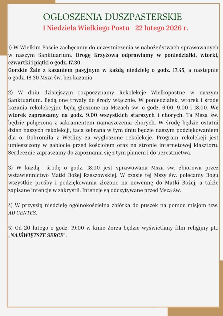 Strona główna » 1 NIEDZIELA Wielkiego Postu – 22 lutego 2026